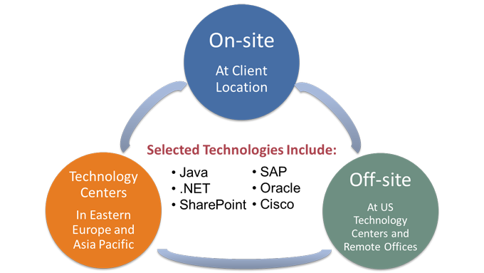 Near-Shore: las capacidades extraterritoriales brindan una opción de menor costo para servicios relacionados fuera del sitio (por ejemplo, pruebas). Near-shore ofrece una alineación más cercana desde el punto de vista cultural, lingüístico y comercial a la vez que proporciona un ahorro sustancial en los costos. Las ubicaciones incluyen Argentina.